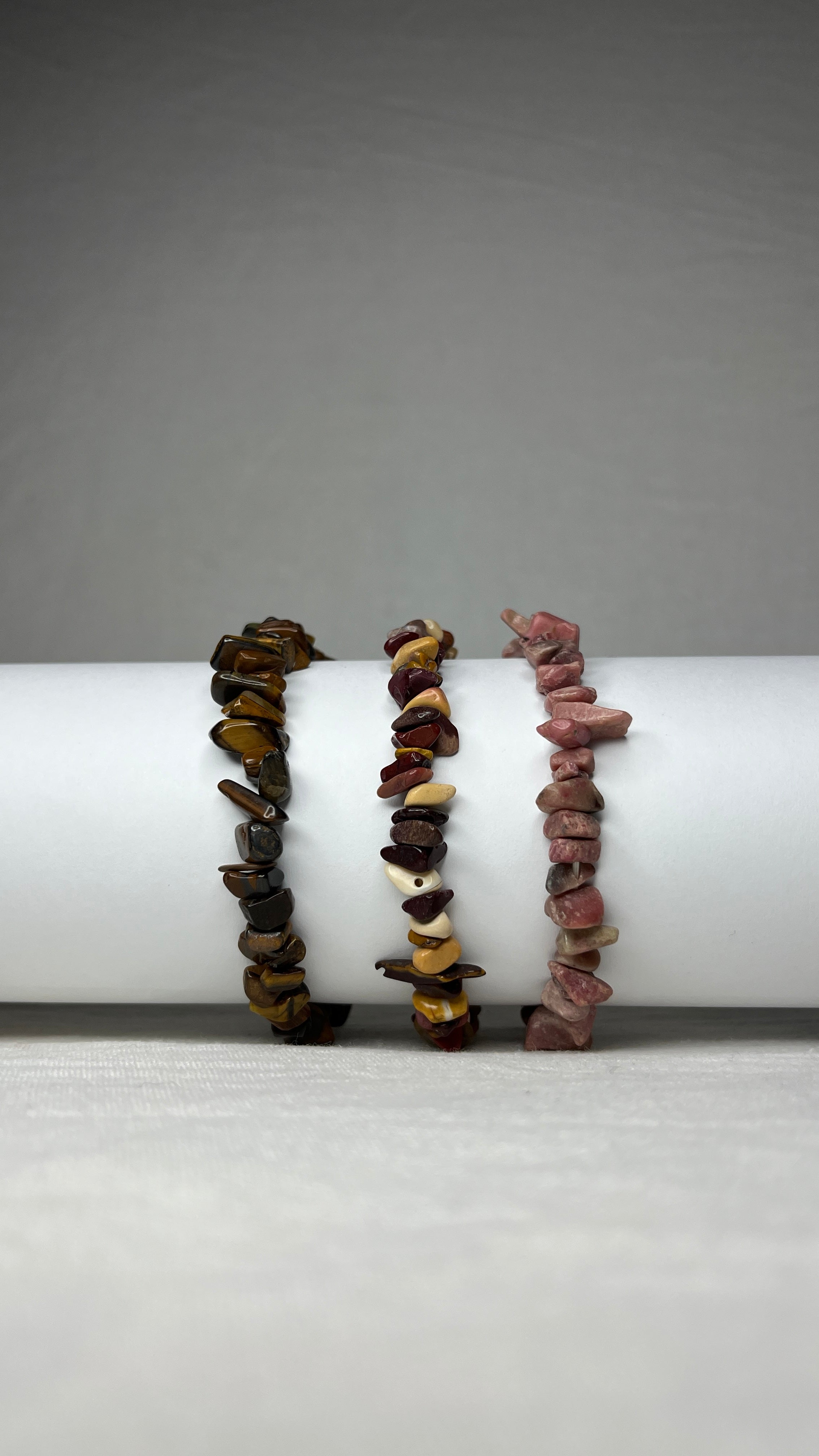 Deze armbandenset van rhodoniet, tijgeroog en mokaiet biedt de perfecte combinatie van kracht en harmonie.