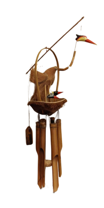 Breng rust en positieve energie in je tuin of huis met deze bamboe windgong met kraanvogel en twee jongen.