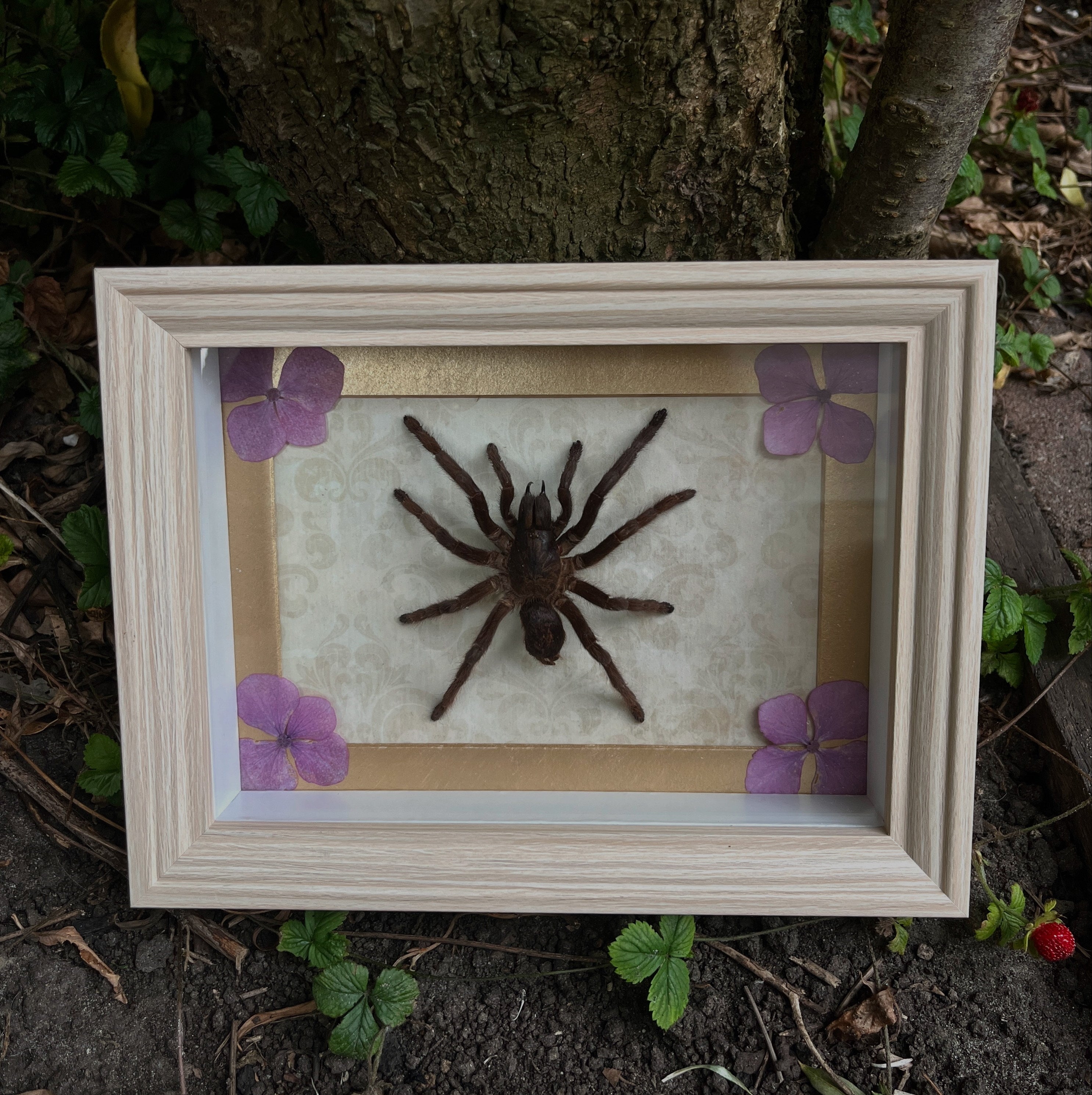 roductomschrijving: Ingelijste Haplopelma Minax Tarantula met Gedroogde Hortensia’s