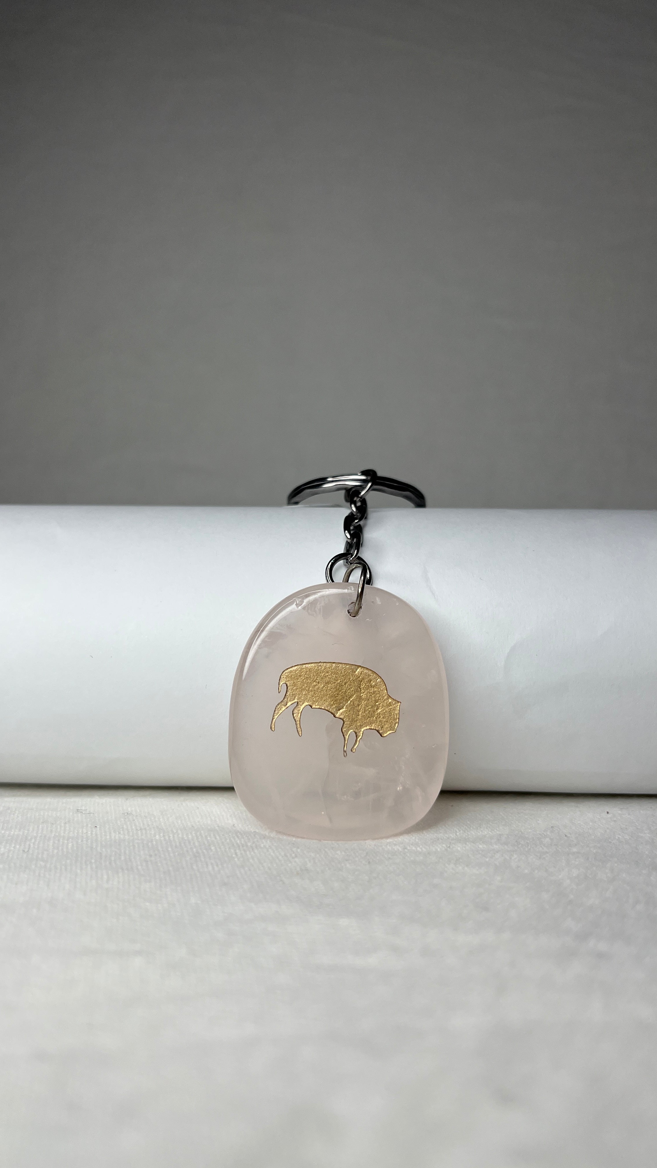 Deze unieke sleutelhanger van rozenkwarts met bizon print combineert zachte liefde met stoere energie.