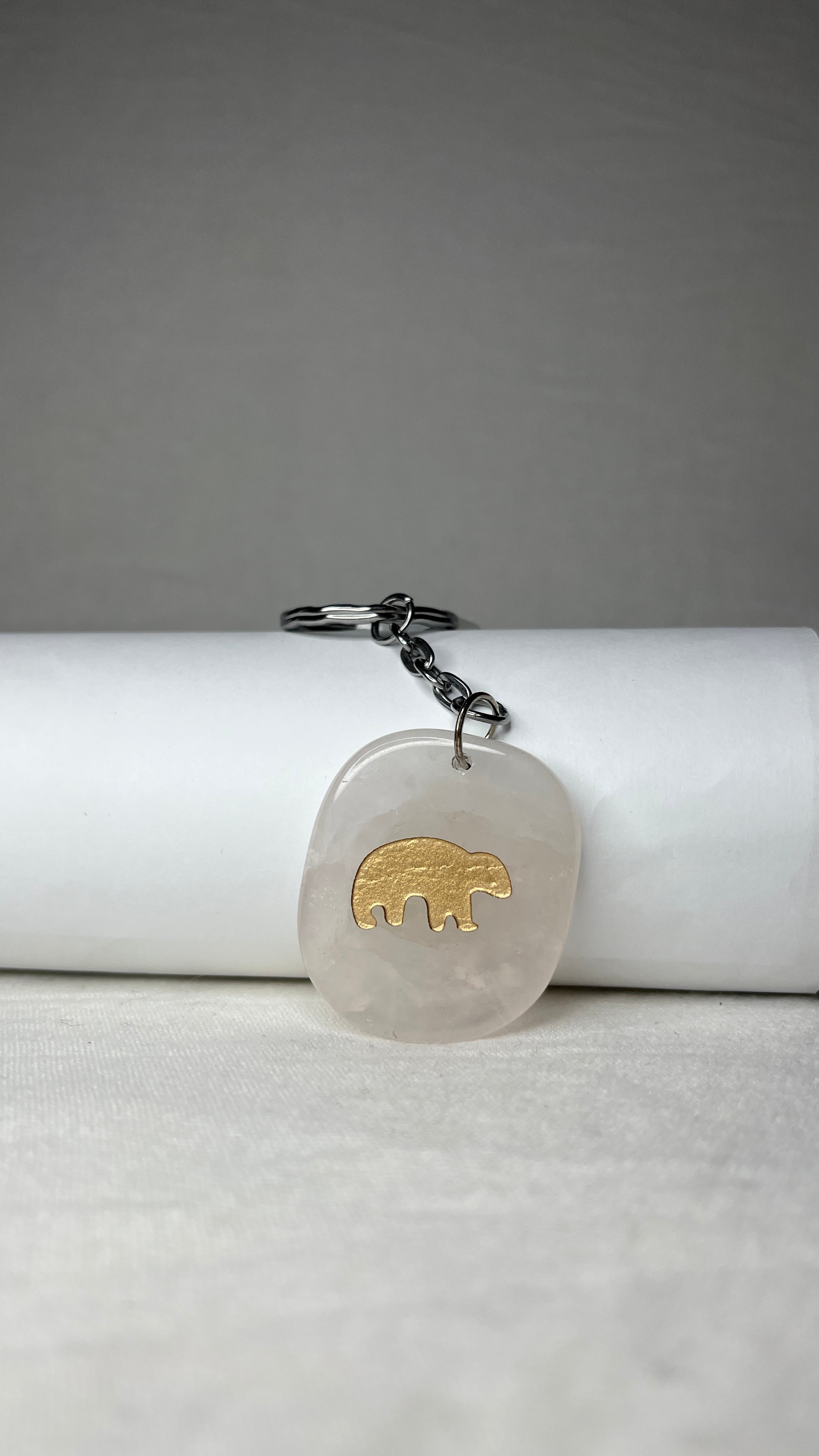 Deze bijzondere sleutelhanger van rozenkwarts met beer print combineert zachte liefde met moedige energie.